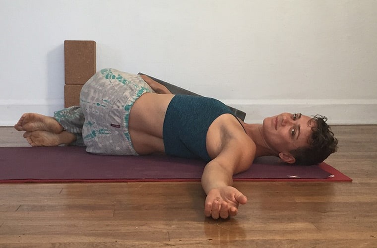 - Exhale as you bring that arm down and thread it through the gap between your right hand and right knee, palm up. Bring your left shoulder and the side of your head to rest on the floor.